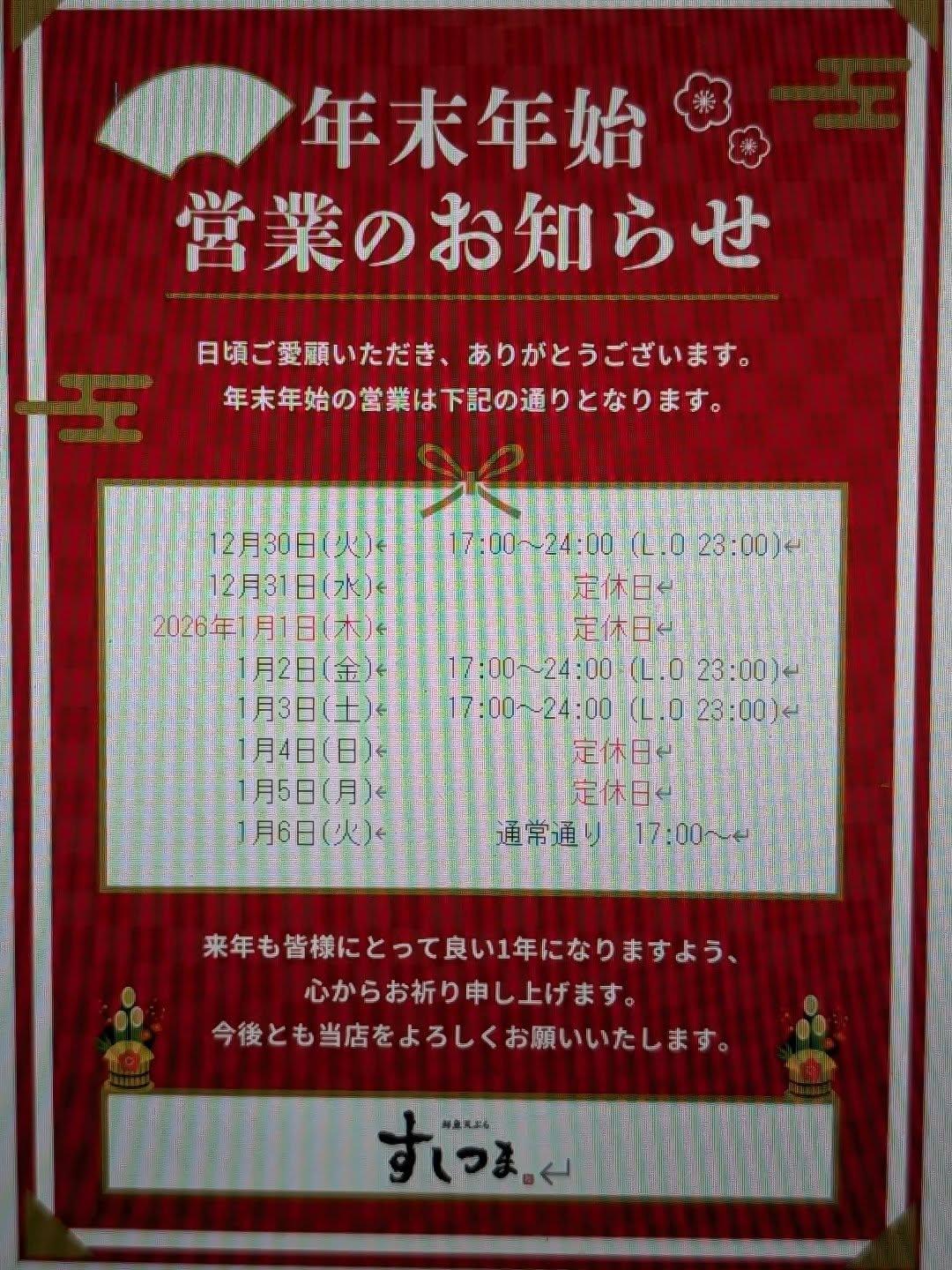 ◆年末年始のお知らせ◆@すしつま名古屋広小路店/個室/居酒屋/海鮮/寿司/日本酒/個室