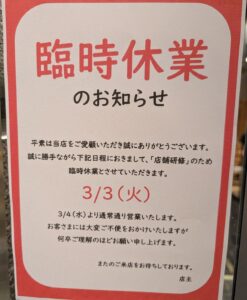 誠に勝手ながら、3/3(火曜)は臨時休業とさせて頂きます。翌3/4(水曜)からは通常通り営業致します!